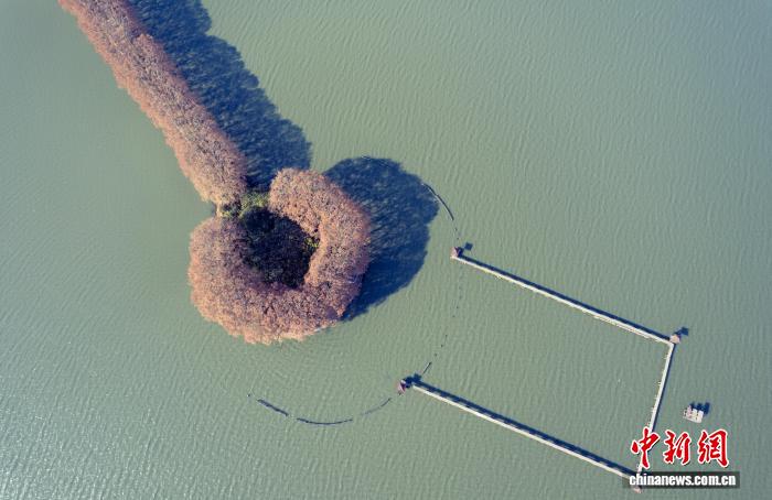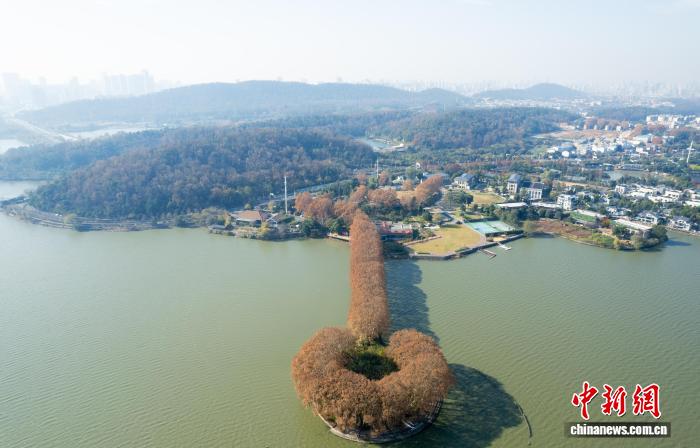 12月3日,航拍武汉东湖绿说团山驿站旁,湖中半岛的湖心步说上,梧桐树叶颜色奇丽。从空中俯视,其宛如1个黄灿灿的“汤勺”,伸进1湖碧水中。(无人机图片)中新社记者 弛畅 摄